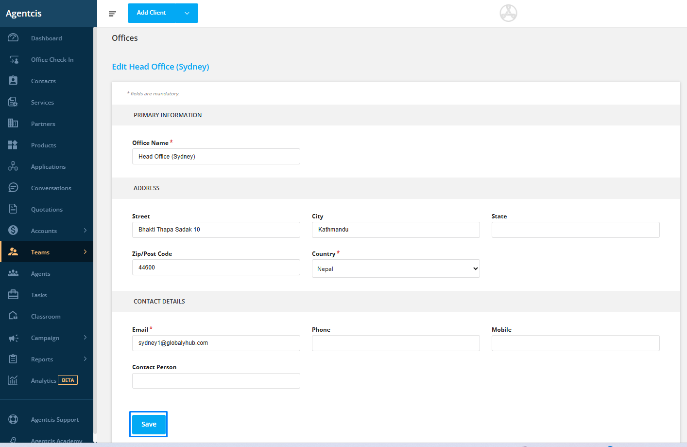 After filling in all the required information, click "Save" to create the new branch office.