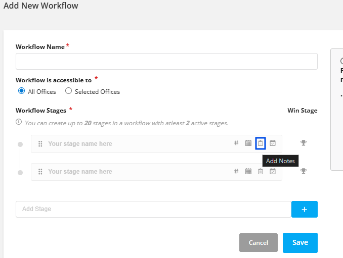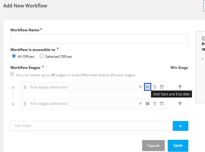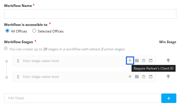 Step 5: You can activate Add Start and End Date, Add Notes Field, Win Stage, and Partner Client ID. (Can only be clicked for a stage, it can not be applied to all the stages). Once you are about to reach the particular stage, a new field will pop up and you have to fill in all the required information in order to proceed to another stage.
