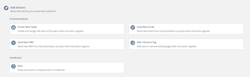 The automation is incomplete without Actions. Trigger will activate certain functions and provide results, conditions then filter those results and finally actions will be performed in those results. In Agentcis, we have 4 actions provided - creating a Task for your users, sending an Email, sending an SMS, Add/ Remove the Tags and setting delay for the next step by some time.