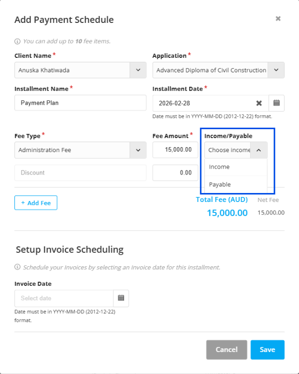 Step 10: According to the revenue type of the application, which is set according to the revenue type of the product, select whether the invoice is income or payable if the revenue type is revenue from client, or just type in the commission percentage if the revenue is commission from partner.