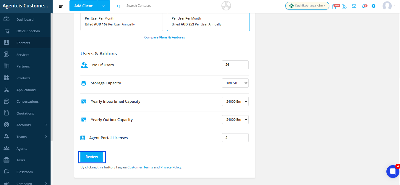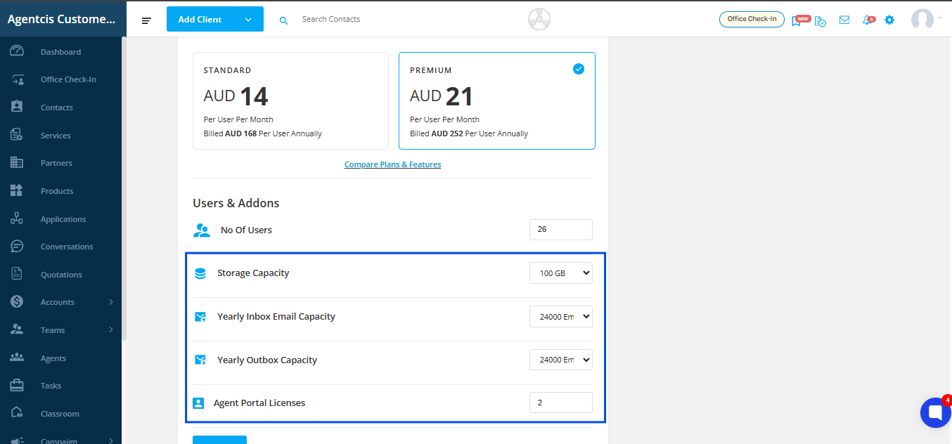 Step 6: You can also purchase Add-ons. Each plan includes a fixed amount of storage, email inbox, email outbox capacity, and agent portal licenses. If you run out, you can purchase additional storage or email capacity by selecting them from the drop-down menu.