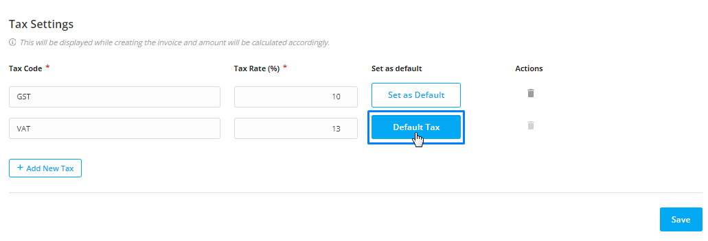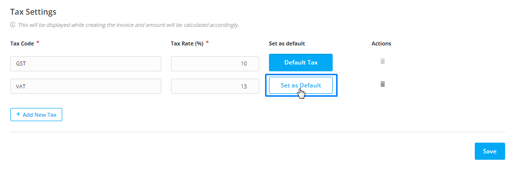 Step 5: You can set the tax code default if you want to do so by selecting the Set as Default tab.