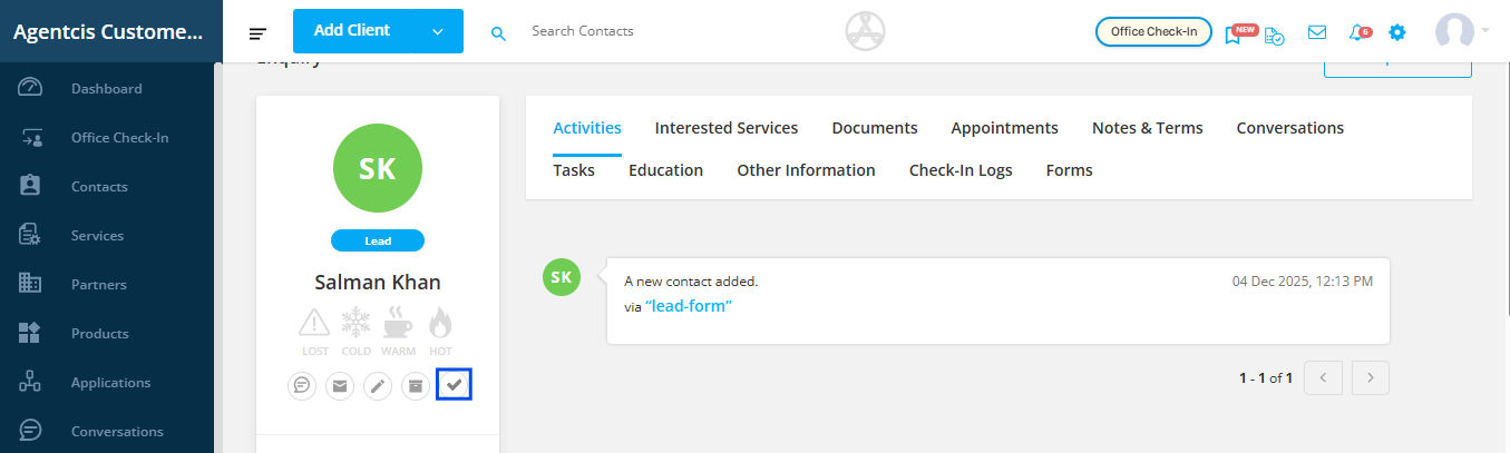 In Agentcis, leads can be collected from various sources, including lead forms, bulk imports, Facebook Lead Ads integration, and check-ins. Once captured, these leads are automatically listed in the Leads section under the Contacts tab for easy tracking and management.