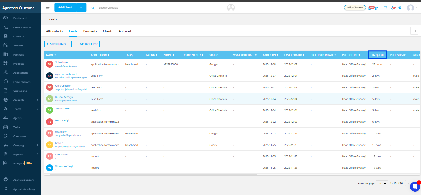 In the Leads list, you will also see In Queue column, which provides you with the time frame the leads have filled up the form so that you do not miss assigning the lead to the assignee or following up the lead. Similarly, you can view other columns such as “Ratings” , “Source”, “Tags”, “Added From” based on which you can nurture the leads.