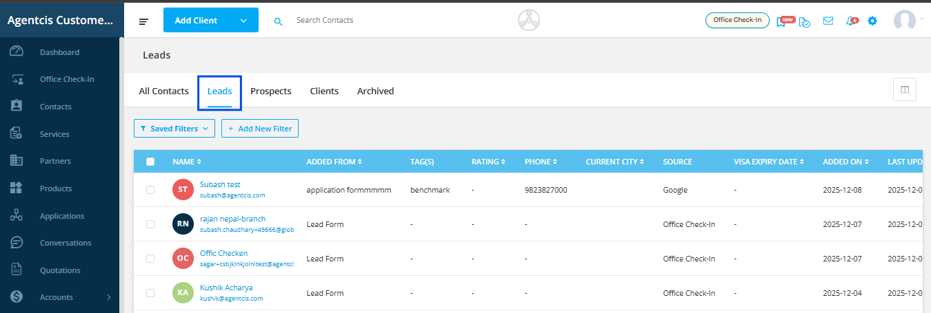 Step 3: If you want to learn to apply certain filter to get the list of the particular enquiries, follow the link: https://support.agentcis.com/en/articles/348-filtering-and-viewing-specific-clients