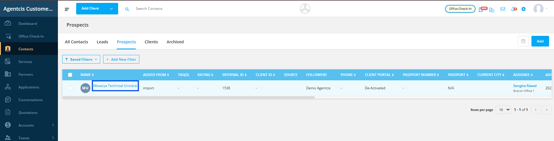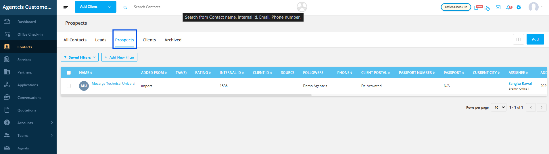 Prospects are the students who have shared their information but have no assigned application. They are assigned to one of the users for further engagement and follow-up. You can manage their details, documents, and interested services.