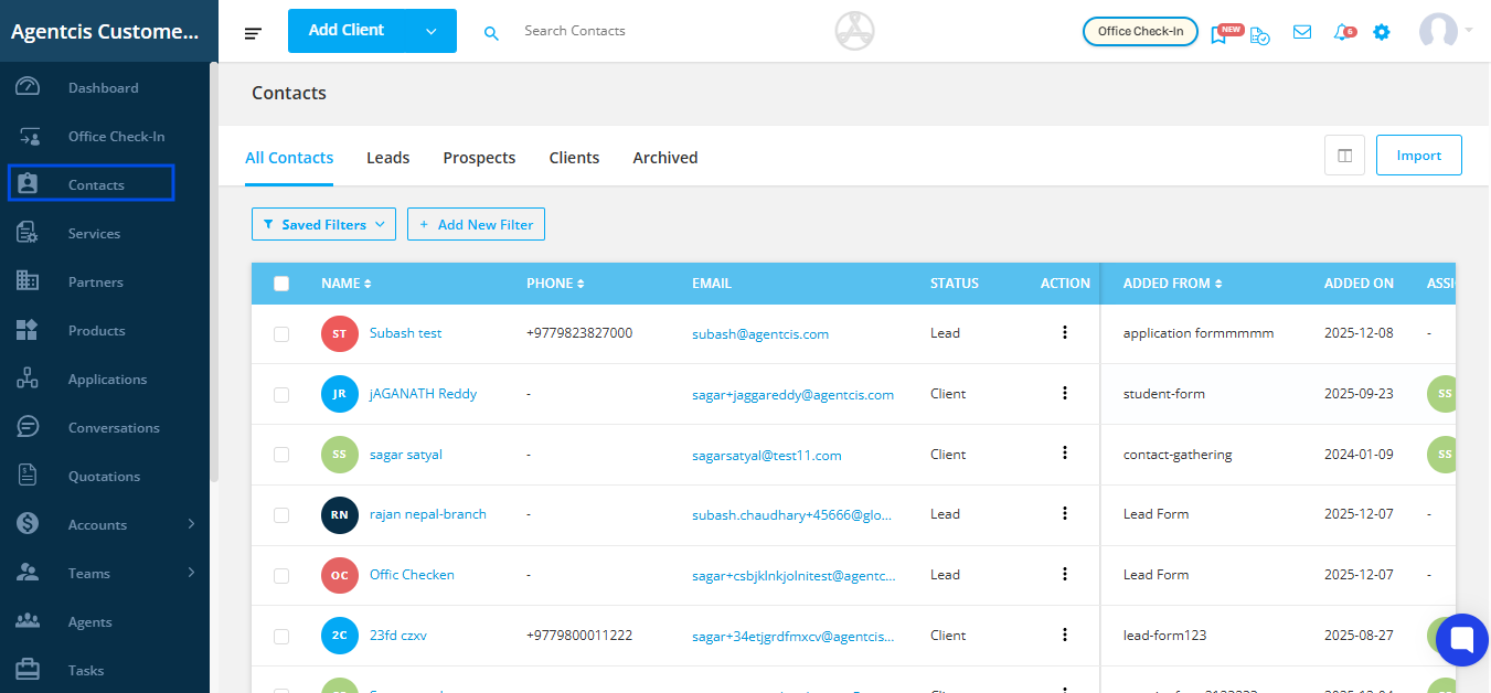 In Agentcis, you can efficiently view and locate clients using various filters, allowing you to find specific clients quickly and reduce search time. This helps in organizing client information, making data management and analysis more seamless. Additionally, you can create custom fields based on your workflow and use them as filters. You also have control over which filters are displayed in the filter section. To manage this, navigate to the Contacts Section from the left-side menu and select the icon shown in the image below: