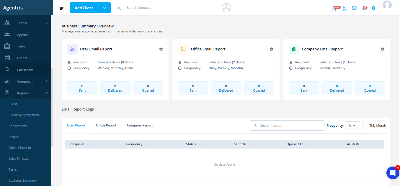 The Business Summary Report is an automated email feature in Agentcis that brings all your essential business activities such as, tasks, deadlines, appointments, contacts, applications, and performance indicators into a single, easy-to-read email.
