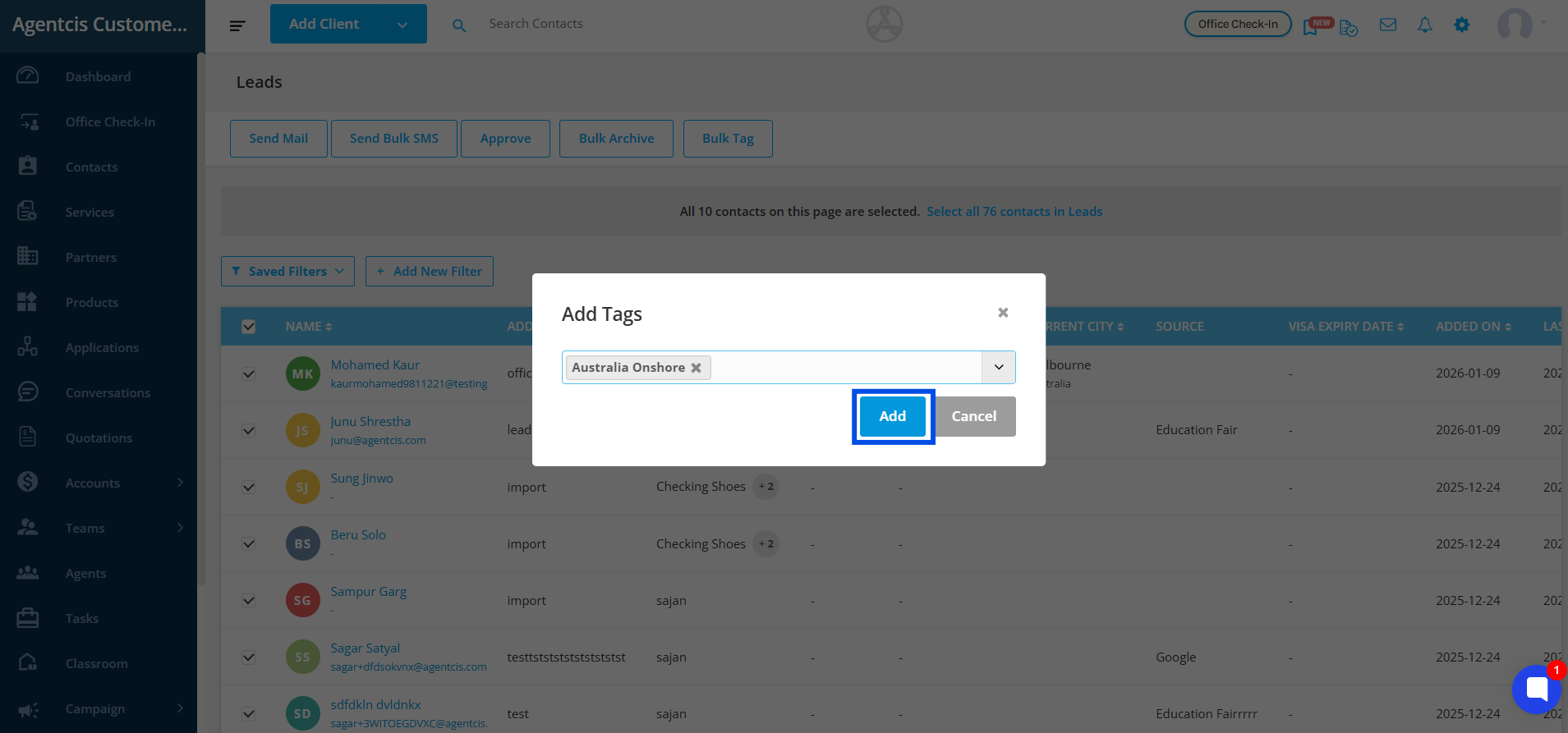 Step 6: Once you have entered the tags, click on “Add” to apply them to all selected contacts.