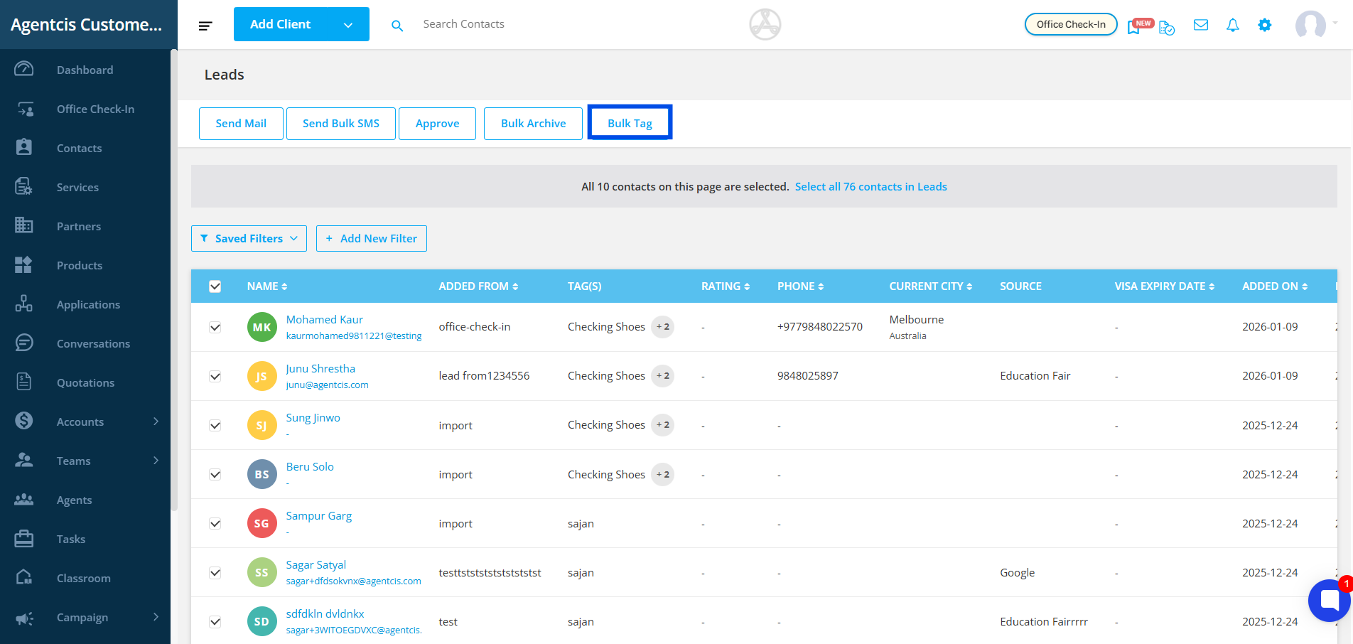 Step 4: After selecting all the required contacts, click on the “Bulk Tag” option to apply tags to all selected contacts at once.