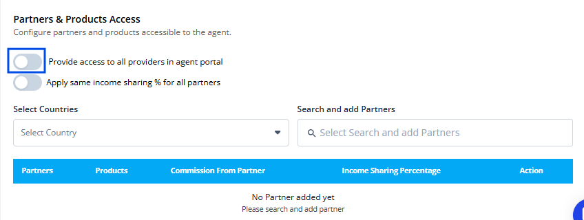 Provide Access to All Providers: Enable the toggle "Provide access to all providers in Agent Portal" to grant the agent unrestricted access to all available providers, allowing them to work with all partners without limitations.