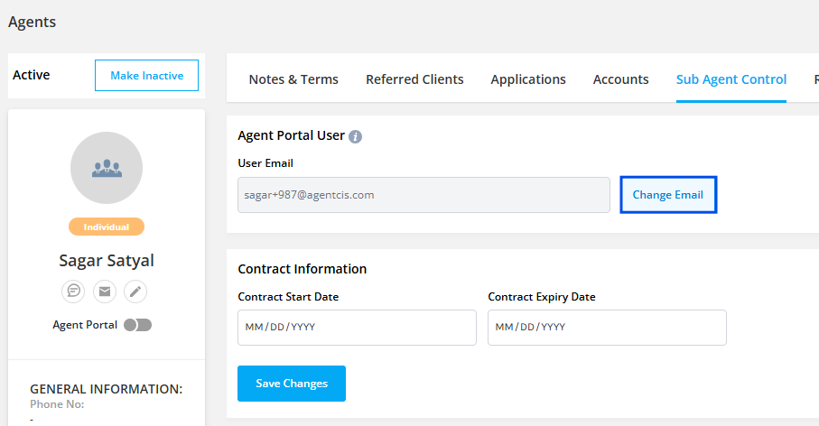Update Portal Login Email: Click on Change Email to update the email address the agent uses for portal login. This ensures the correct individual maintains appropriate access, particularly useful when an agent changes email addresses, access needs to be transferred, or a previous email becomes inactive.