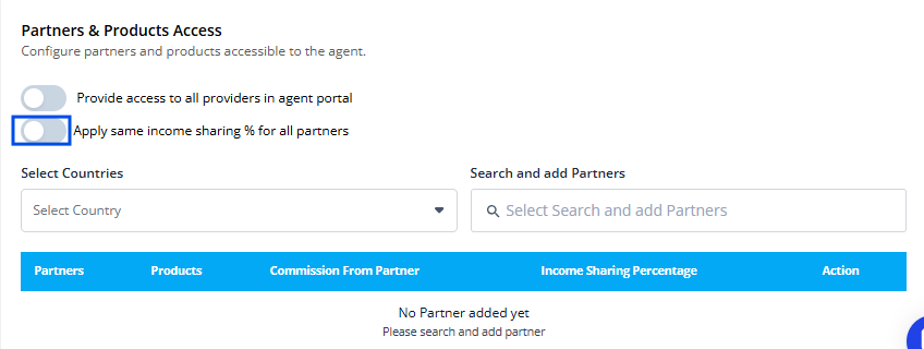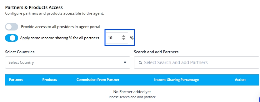 Configuring Income Sharing: Apply Same Income Sharing Percentage for All Partners. Enable the toggle "Apply same income sharing % for all partners" to assign a single income sharing percentage across all partners. This ensures consistency and saves time by eliminating the need for individual configuration.