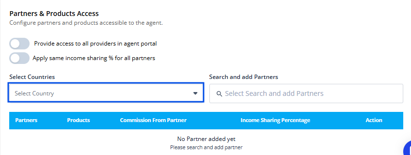 Provide Access to Specific Partners: Select a country from the dropdown menu and search for specific partners to grant targeted access. This helps control partner visibility and ensures agents only work with relevant partners based on your business requirements.