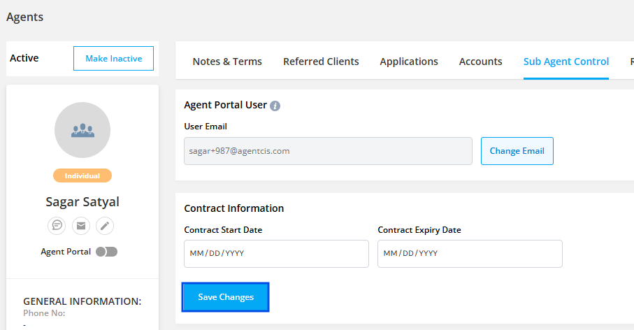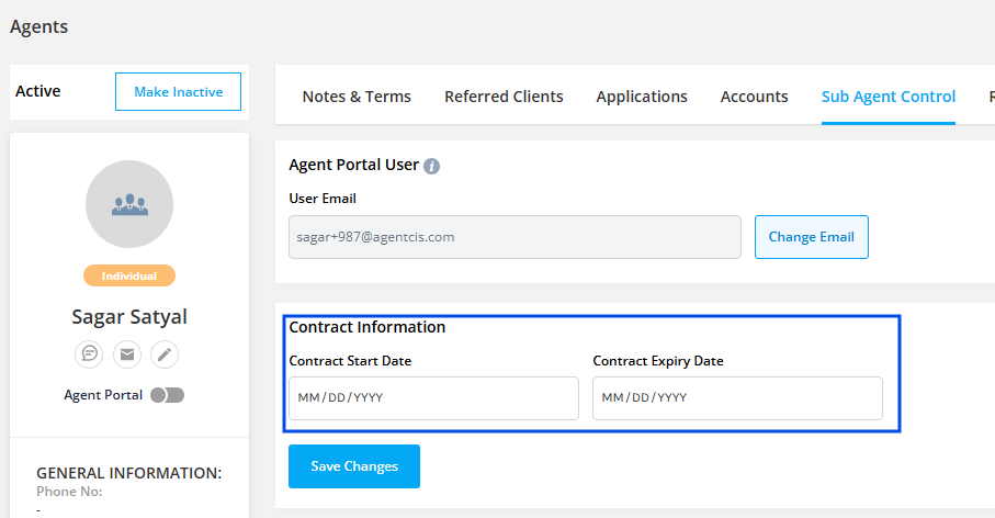 Set Contract Duration: Define the Contract Start Date and Contract End Date to establish the period during which the agent will have access to the Agent Portal.