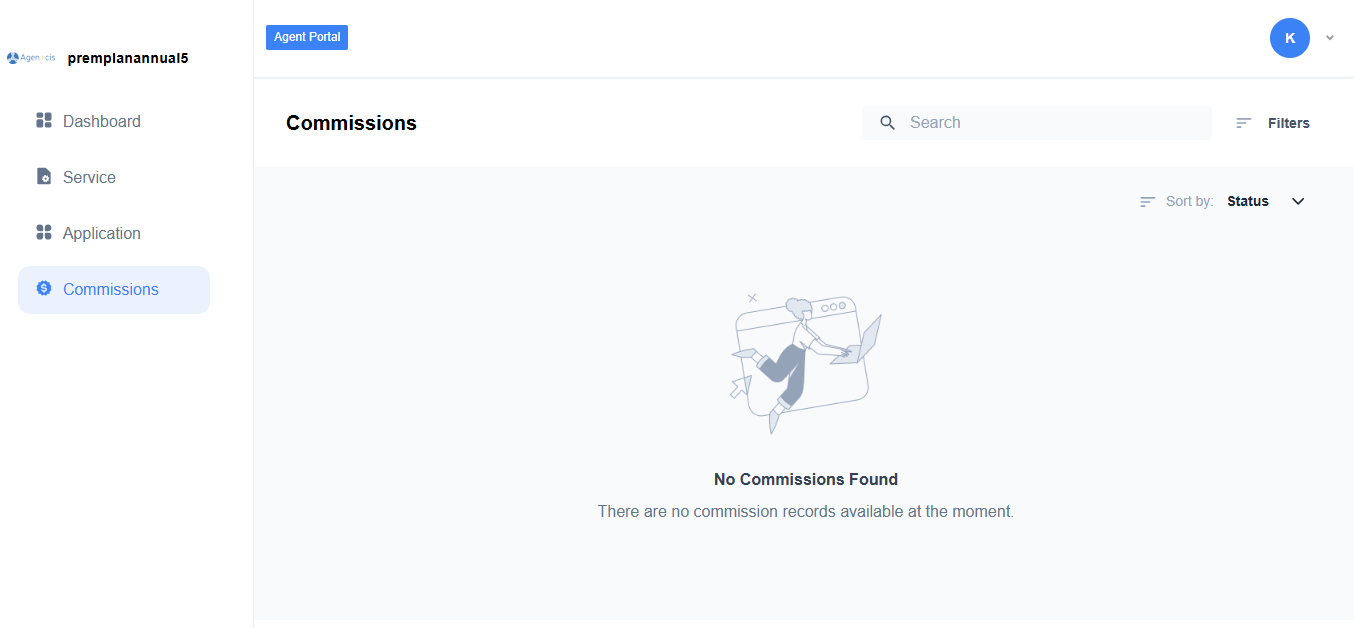 Agents can use filters to narrow down commission records and sort by status to organize their view.