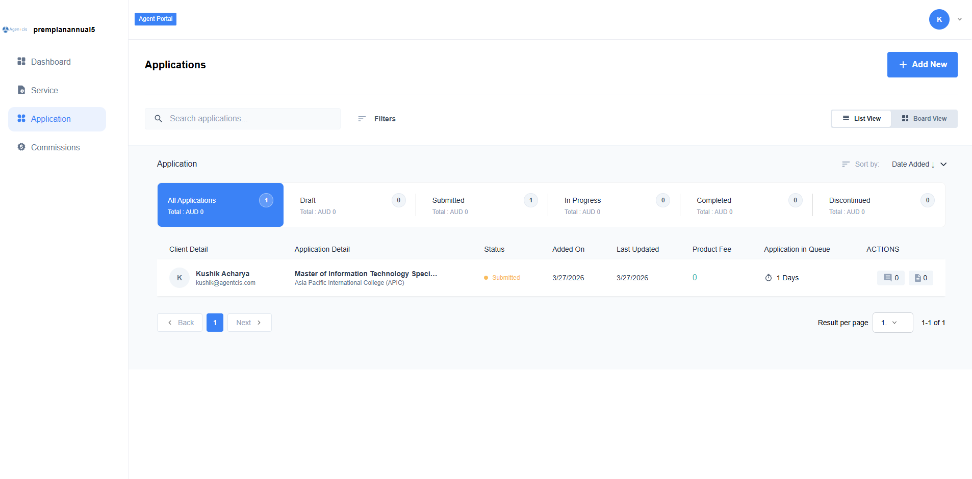 From the Applications tab, agents can view and manage all client applications. Applications are displayed with client details, application detail, status, added on date, last updated date, product fee, application in queue, and action. Agents can search for specific applications using the search bar and apply filters to narrow down results.