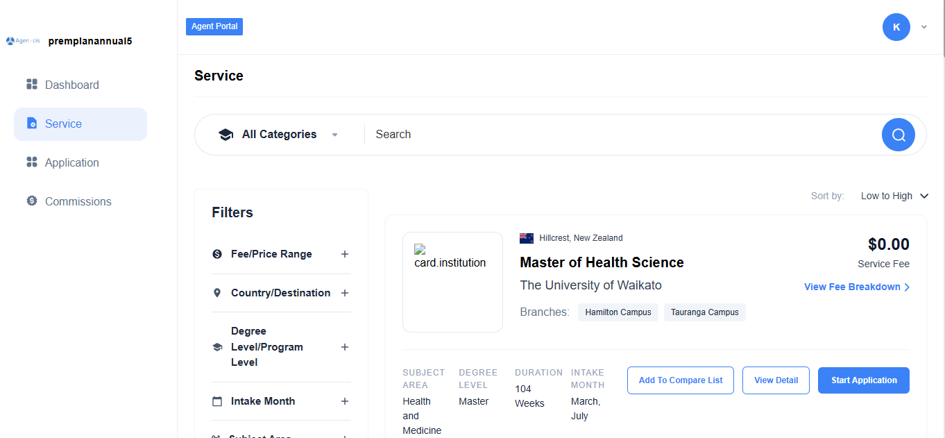 From the Services tab, agents can browse programs from partner institutions. Each program card displays the institution name, program title, service fee, country, campus branches, level, subject area, duration, and intake months.