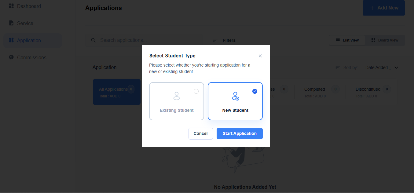 Step 3: Choose whether the application is for an existing or new student. If the client has been added before, select Existing Student. If not, select New Student to add their details. Click Start Application to proceed.