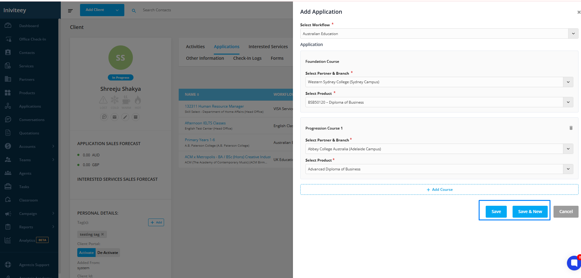 If your client is enrolling in a package program (for example, an English course followed by a Bachelor’s program), you can add additional courses to the same application.