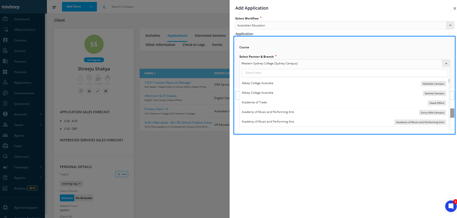 To convert a prospect into a client or to process additional services for an existing client, you need to add an application to their profile. Applications are central to managing the services a client has chosen, and they help track the process through predefined workflows.