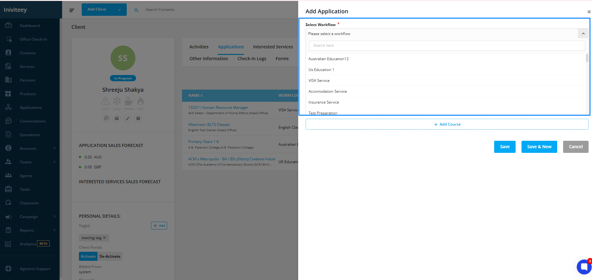 From the dropdown menu, choose the appropriate Workflow that matches the service you are processing (e.g., University Admission, Visa Process, Language Test).
