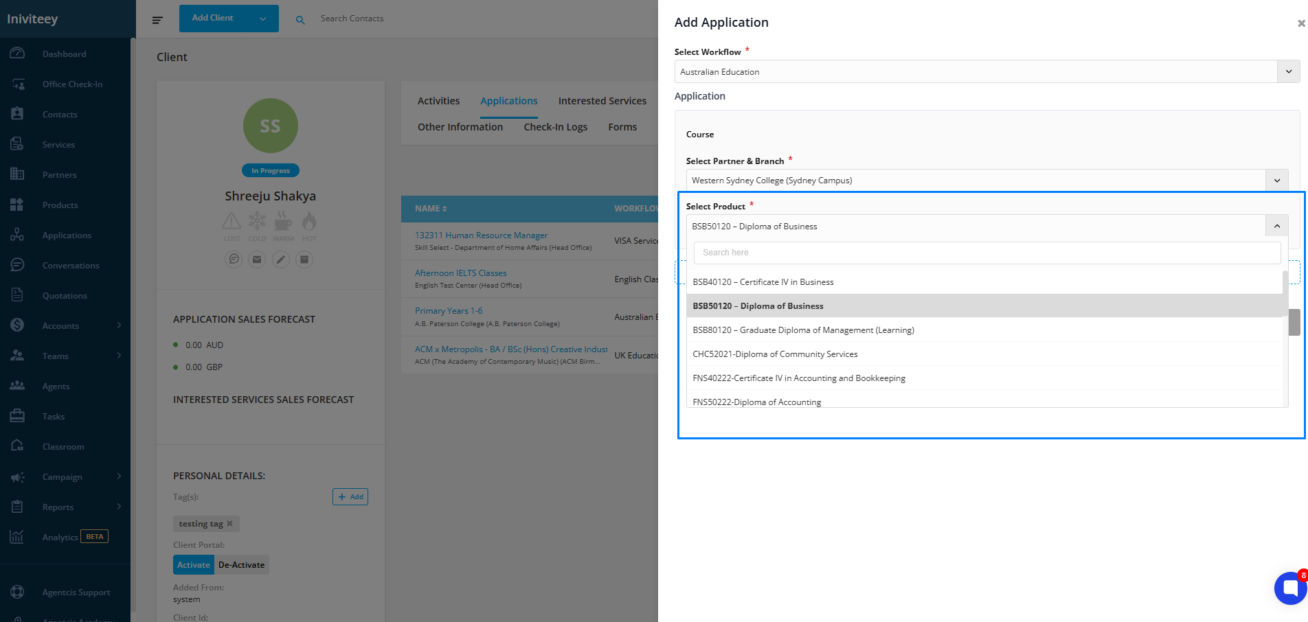 Choose the specific Product the client is applying for (e.g., Bachelor of IT, Master of Business, English Preparation Course).