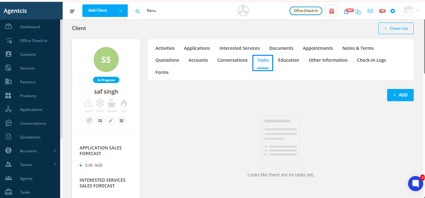 You can create tasks from various parts of Agentcis: the top bar, contact profile, application detail page, partner profile, or dashboard.