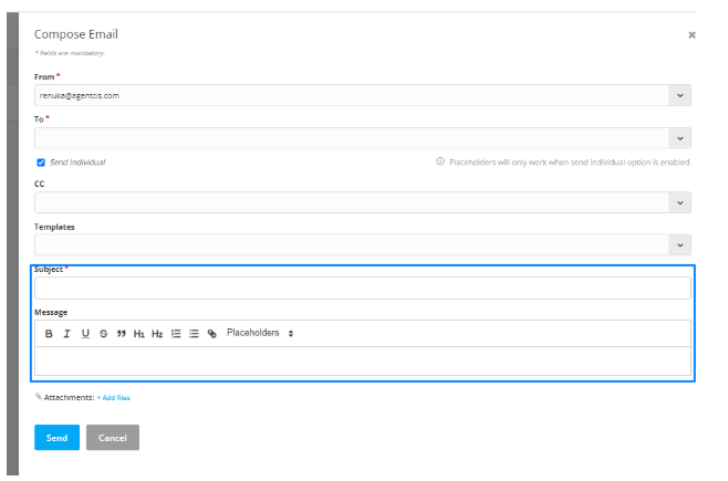 Agentcis offers a streamlined email communication system that allows you to send emails directly from your workspace. Whether you're coordinating with your team, responding to clients, or forwarding documents to partners, the built-in email functionality ensures everything is tracked, personalized, and organized.