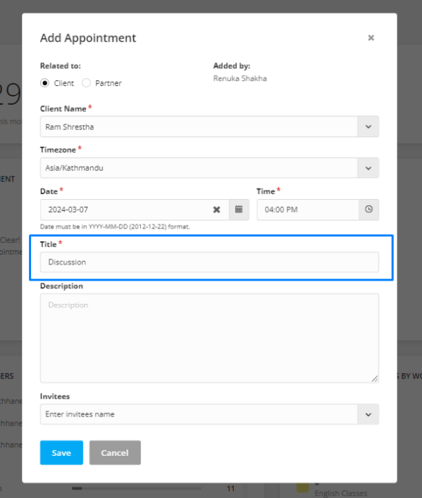 Note: Appointments can also be created from the Dashboard or from within the Client or Partner detail pages.